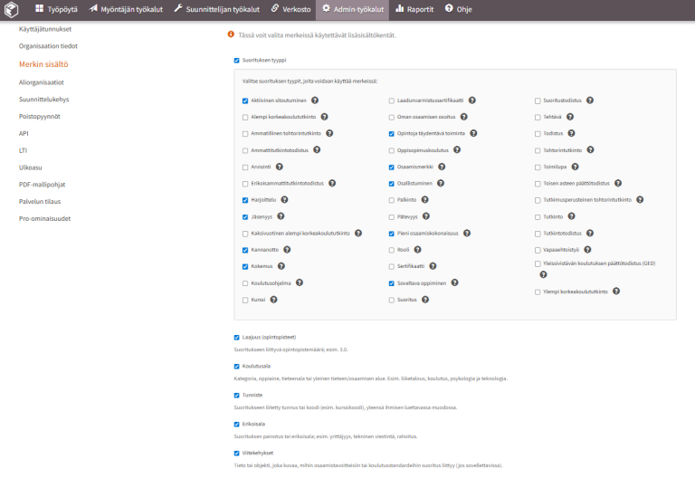 Open Badge Factoryn merkkieditorissa on nyt käytettävissä uusia 3.0-standardin mukaisia lisäsisältökenttiä (metatietokenttiä): Suorituksen tyyppi • Opintopisteet • Koulutusala • Tunnus (Human Code) • Erikoisala
